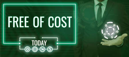 Conceptual caption Free Of Cost. Business showcase No price for a trial version or a sample given Promotion Man Holding Futuristic Design In One Hand And Presenting Late Data.