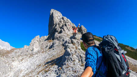 A couple hiking in Hochschwab region in Austrian Alps. They are climbing a sharp rock. The man is taking a selfie. Idyllic landscape. Freedom and wilderness. Pathless wandering. Massive mountain chain