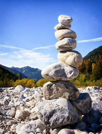 Banner balanced Zen stones on nature mountains background.