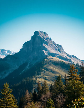 Mountain landscape with coniferous forest and blue sky in the background