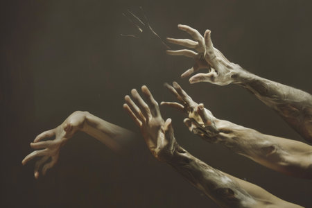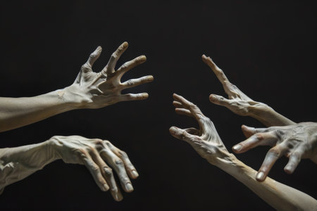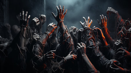 Zombie hands emerge from the darkness, adorned with black blood setting a haunting Halloween scene. Created with generative AI tools