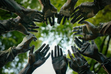 A circle of bronze hands extending upwards, creating a powerful image of unity and support. The backdrop of green trees adds depth and a sense of natural beauty to the artwork.