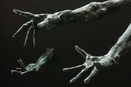 A striking image featuring multiple outstretched hands reaching for the dark sky, evoking feelings of fear and desperation in a surreal and atmospheric landscape.