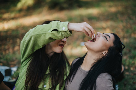 Two friends enjoying a playful moment during a picnic outdoors