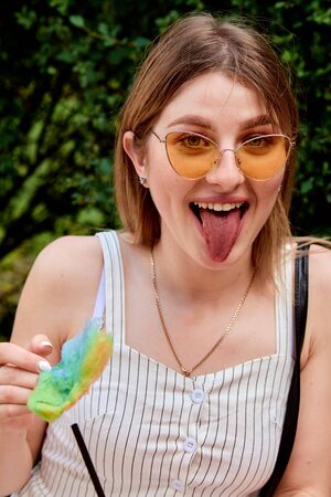 Happy joyful beautiful young woman with candy floss, spun sugar, cotton candy in the park at summer. Summer time events. Summer vacation. Vacation time. Young woman portrait.