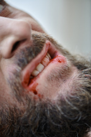 cropped view of anxious man biting his lips till blood during depressive episode, mental health