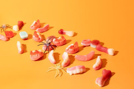 Halloween jelly beans in the shape of worms, skulls, frogs, vampire teeth, brains, bones, spiders, licorice spirals on orange background with hard shadow. Festive sweets pattern, gummy trick or treat.