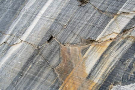 The surface of marble reveals intricate natural veins and textures highlighting its rich colors and patterns, found in a quarry setting.