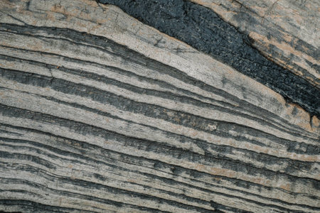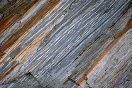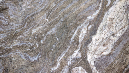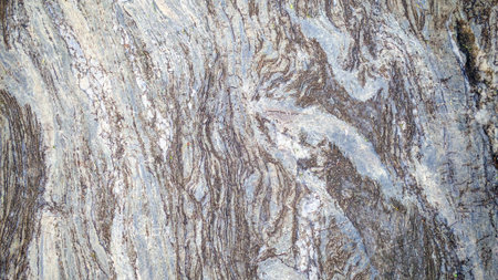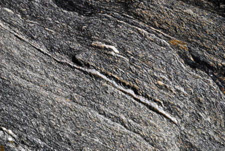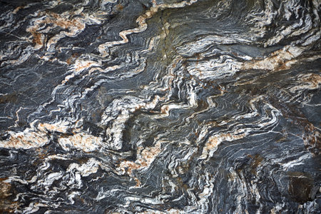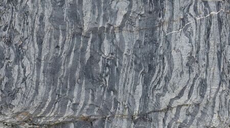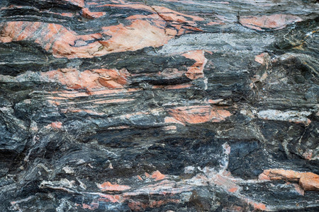 Close up of rock surface, gneiss with white folded quartz veins due to the power of geologic crustal movement