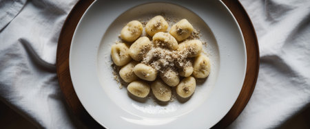 Plate of gnocchi with parmesan and pepper is served on a white tablecloth for an Italian dinner.
