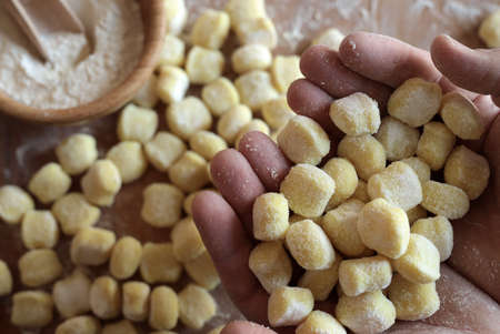 Hands holding uncooked potato gnocchi. Close-up. Directly above.
