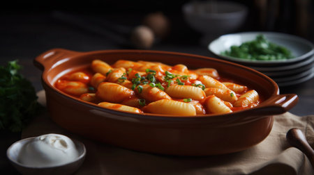 Detailed close-up of vegan gnocchi with tomato sauce on a rustic plate, showcasing the simplicity and elegance of the dish. AI generated.