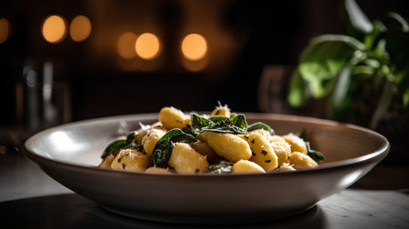 Plates of traditional gnocchi rest in a savory sauce, garnished with vibrant basil leaves, creating a delightful Italian dish enjoyed in a warm and inviting atmosphere, banner