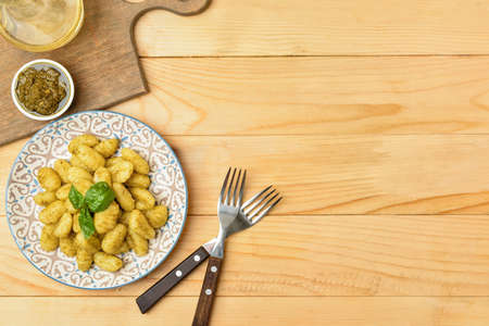 Gnocchi with pesto sauce in plate on wooden table. Top view Copyspace