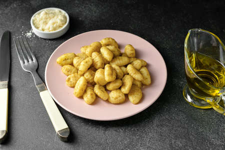 Gnocchi with potatoes. Traditional italian food from Rome, Sardinia, south of italy. Homemade gnocchi with parmesan, egg, cornmeal (semolina). On a wooden table. High quality photo. Above. Copy space