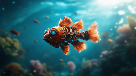 Steampunk fish in vibrant ocean setting with mechanical details.