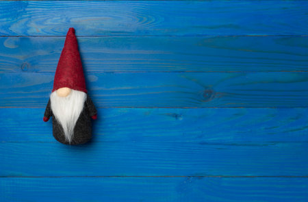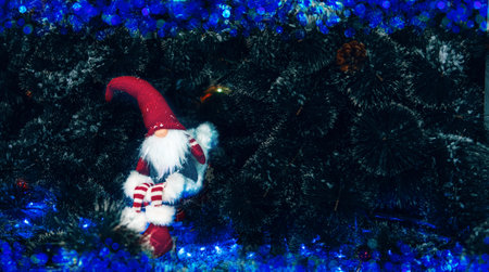 gnomes on the christmas tree. Christmas outdoor background greeting card with fir branches, decorations and blurry lights on the back