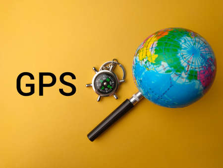 Top view compass,magnifying glass and earth globe with the word GPS (Global Positioning System)
