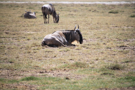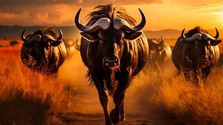 wildebeest in the grasslands of the game reserve in Southern Africa, generated by AI. High quality photo