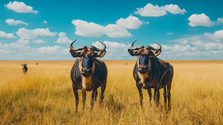 Generative AI Image of Two Wildebeests in the Vast Savanna at Bright Sky Wallpaper