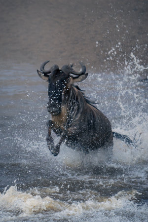 Wildebeest Connochaetes taurinus running in water, South Africa, Wildebeests are crossing Mara river. Great Migration. Kenya. Tanzania. Maasai Mara National Park, AI Generated