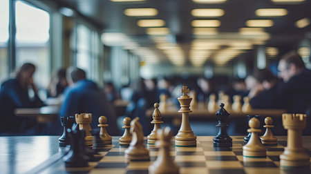 A chess tournament in progress, showing multiple chessboards and players deeply focused on their games in a large, well-lit hall.