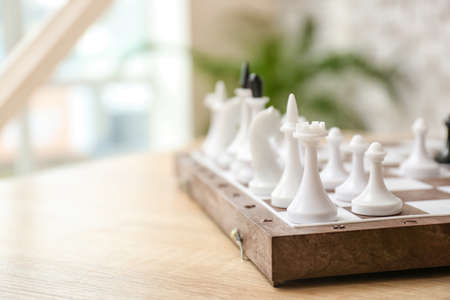A chess board and black and white chess pieces on a wooden table, close-up, selective focus