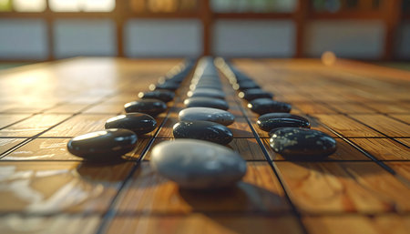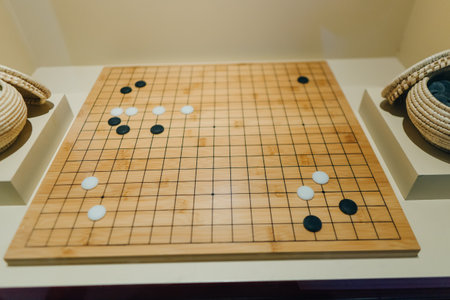 A beautifully captured close-up of a traditional Go game board featuring black and white stones on a natural wood surface, reflecting strategic thinking and cultural significance.
