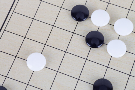 GO Japanese traditional game playing black and white stone pieces on wooden grid board. Strategy and concentrate game