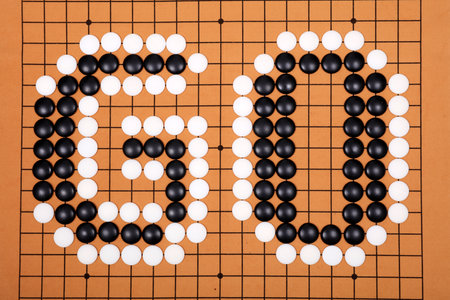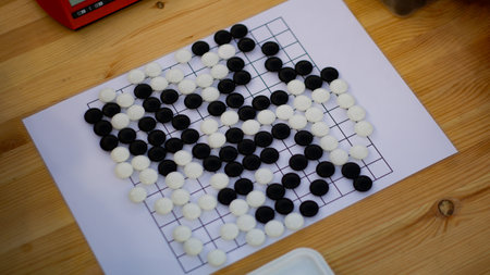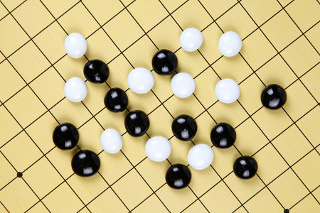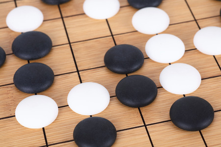 Chinese go game board, close up view of playing black and white stone pieces, Alphago