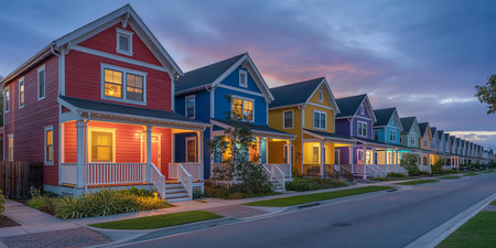 Vibrant Row of Colorful Houses with Black Roofs on Tree-Lined Streets in a Charming Neighborhood