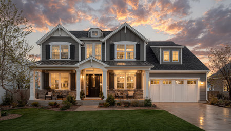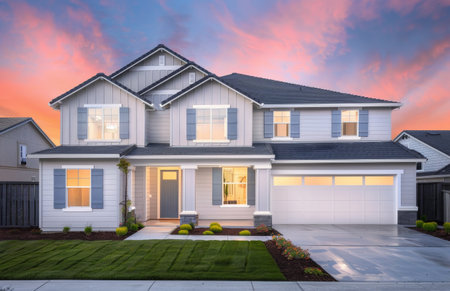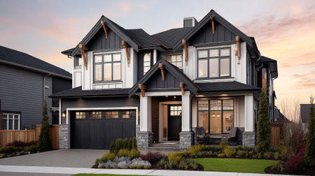 Beautiful Two-Story Home with Black Accents at Sunset for Real Estate