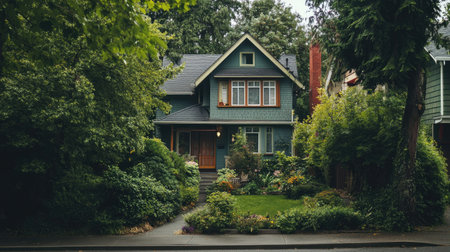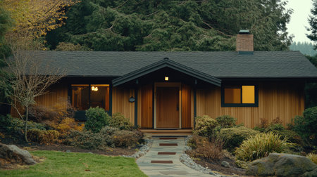 Suburban house with large front yard and garden at twilight. Northwest, USA