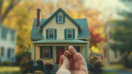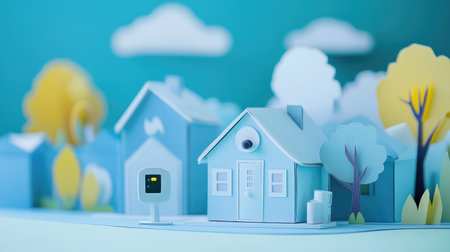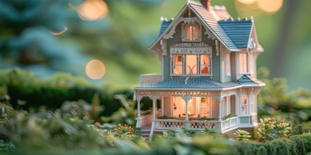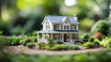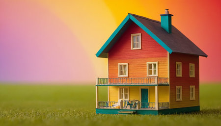 A delightful miniature house featuring a striking red door set against a charming blue exterior. This image captures an enchanting ambiance of comfort and community.