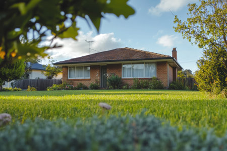 A cozy brick house sits amidst a vibrant green lawn, showcasing well maintained gardens under a clear blue sky during the day.