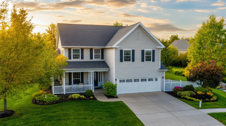 Charming two-story suburban home with white fence and manicured lawn at sunset.