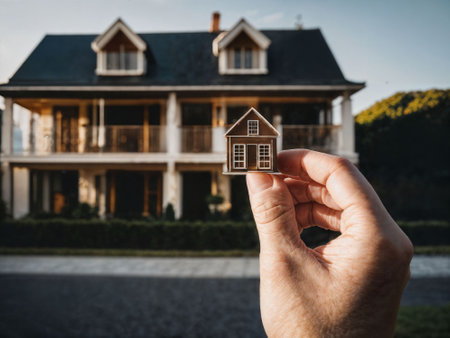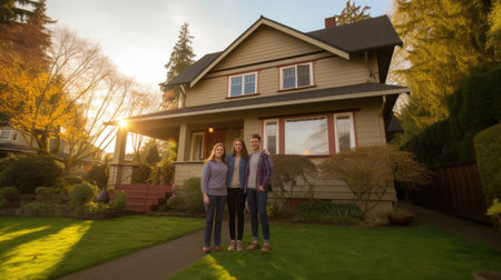 Happy modern family posing in front of their beautiful home. Mortgage payment