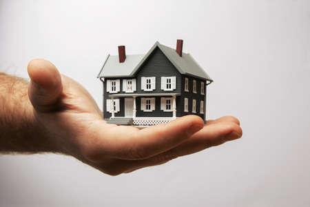 Real estate agent home sales broker is using a pen pointing to the house model and explains the business contract, rent, buy, mortgage, loan, or home insurance