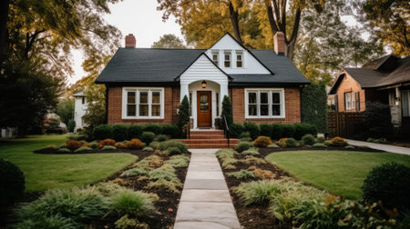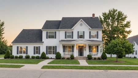 A classic white cottage with black shutters, nestled in an upscale neighborhood. The front yard is well-maintained and lush green grass. A small path leads to the entrance of the house, which has large windows that face two sides. In one window hangs a light bulb. On both side walls there's chimney, the roof of shingle on top. There are some trees around it. This scene conveys warmth, comfort, family love and security. Shot by professional photographer using Canon EOS R5 camera with wide-angle lens --ar 3:2 --v 6.1 Job ID: 3da28c17-712e-4c14-8a14-3f969a1c9872