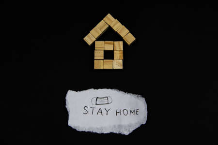 Toy house from cubes on a white background. A toy house made of wood cubes. With a sign saying stay at home.