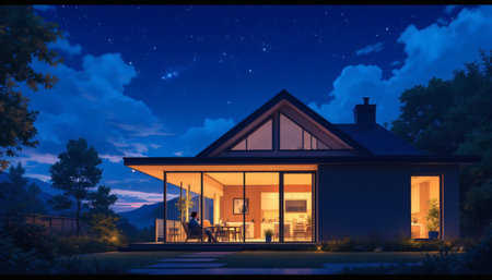 A person relaxes inside a modern house at night, illuminated warmly against a starry sky. Perfect for real estate or home design projects.