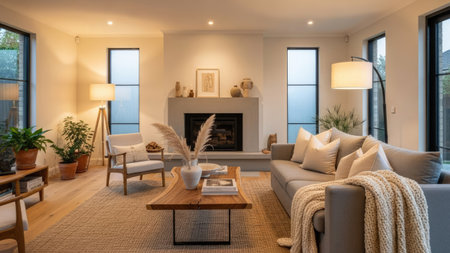 This image showcases a modern living room interior. The scene features a sofa, chairs, and a coffee table. Warm lighting enhances the room's ambiance. Soft textures and neutral colors are prominent. It's suitable for illustrating themes related to home decor and interior design for various commercial applications.