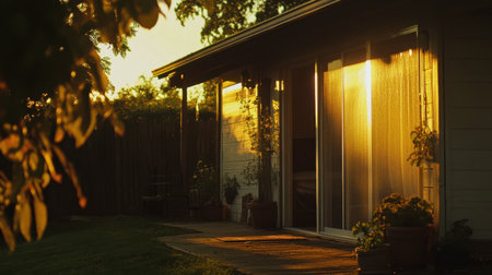 A warm sunset glow reflecting off a glass patio door in a cozy countryside home.