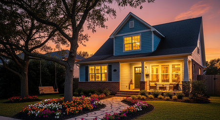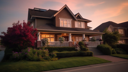 Suburban home showcases modern design with large windows and a cozy porch, surrounded by lush greenery, creating a serene evening atmosphere with vibrant sunset colors