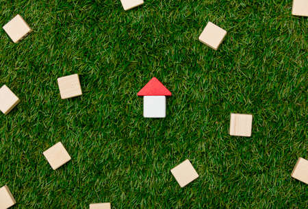 Concept of wooden toy house and other blocks around on green grass. Above view
