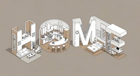 A detailed line isometric forming the word HOME with miniature interior rooms. Each letter is meticulously drawn to represent different areas of a house, including a living room, a kitchen, and a bedroom. The style is clean and precise, emphasizing the architectural details and the arrangement of furniture within each letter.
