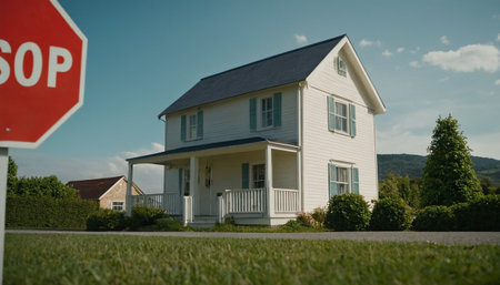 A charming, small white house surrounded by lush greenery and a stone pathway, creating a serene, inviting atmosphere.