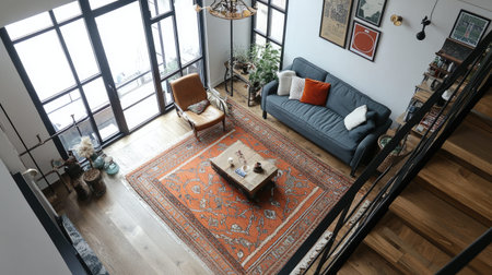 This inviting living room features modern furniture, vibrant artwork, and abundant natural light. The warm wooden floors and stylish decor create a cozy atmosphere.