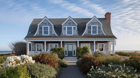 cape cod house exterior, with view of ocean and beach in the distance, created with generative ai
