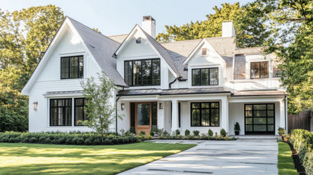 A charming family home featuring modern architecture, surrounded by a well-manicured lawn and inviting design. The perfect blend of comfort and style in a serene neighborhood.